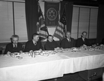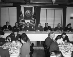 Description :VUE DE L'ENSEMBLE DE LA SALLE OU SE DEROULE LE BANQUET. EN AVANT-PLAN, DEUX TABLES PARARELLES AVEC DES FEMMES ET DES HOMMES QUI MANGENT. EN ARRIERE-PLAN, LA TABLE D'HONNEUR. ASSIS A LA TABLE, DE GAUCHE A DROITE: GEORGE CARR, DIRECTEUR NATIONAL...