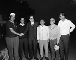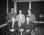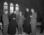 Description :NNGF974: TROIS HOMMES ET DEUX PERES BENEDICTINS EN TRAIN DE DISCUTER. DE GAUCHE A DROITE: LE JUGE JEAN-CHARLES SAMSON, DE LA COUR DU BIEN-ETRE, LE PERE DOM ODULE SYLVAIN, ABBE, CHARLES-EMILE BELANGER, DOYEN DE LA FACULTE DE COMMERCE DE L'UNIVE...