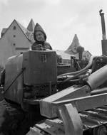 Description :NNGF950: GROS PLAN D'UN MOINE BENEDICTIN AVEC SON CAPUCHON SUR LA TETE EN TRAIN DE CONDUIRE UN BOUTEUR (BULLDOZER). - NNGF951: UN MOINE BENEDICTIN AVEC UN CASQUE SUR LA TETE CONDUIT UN BOUTEUR. A GAUCHE, L'ABBAYE. - NNGF952: DEUX EMPLOYES ET U...