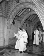 Description :NNGF958: DOM JEAN-GILLES FLYNN ET DOM OSCAR-COLUMBA O'BRIEN MARCHENT DANS UN CORRIDOR DU CLOITRE TOUT EN TENANT UNE BOUGIE. DERRIERE EUX, UN MOINE QUI TIENT UNE CROIX, MONSEIGNEUR GEORGES CABANA AVEC SA CROSSE ET SA MITRE SUR LA TETE ET D'AUTR...