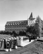 Description :NNGF968 ET NNGF969: PROCESSION FUNERAIRE SE DIRIGEANT VERS LE CIMETIERE SITUE A COTE DE L'ABBAYE ST-BENOIT-DU-LAC. HUIT FRERES BENEDICTINS EN SOUTANE PORTENT LE CERCUEIL DE DOM O'BRIEN. - NNGF970: GROUPE DE GENS REUNIS AUTOUR DE LA FOSSE DE DO...
