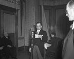 Description :NNGF977: LOUIS CODERE EN TRAIN DE LIRE UN TEXTE AU MICRO DE CHLT. A GAUCHE, ALPHEE GAUTHIER ET LE MAIRE J.-W. GENEST ASSIS. A DROITE, UN TECHNICIEN DE LA RADIO AVEC DES ECOUTEURS SUR LA TETE. EN AVANT-PLAN, UN HOMME. - NNGF978: TROIS HOMMES SE...