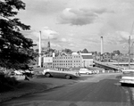 Description :NNGF993: VUE DE L'USINE DE PATE ET PAPIER DE LA ST. LAWRENCE CORPORATION LIMITED. A GAUCHE, UNE CHEMINEE. A DROITE, UN BARRAGE. EN AVANT-PLAN, DES AUTOS. EN ARRIERE-PLAN, LE CLOCHER DE L'EGLISE SAINT-LOUIS-DE-WESTBURY, UNE CHEMINEE ET DES BATI...