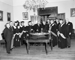 Description :DOUZE HOMMES REGARDENT LA MAQUETTE DE L'ECOLE DE GENIE PLACEE SUR UNE TABLE. UN GRAND NOMBRE PORTE UNE TOGE ET UNE TOQUE. DE GAUCHE A DROITE: OLIVIER RENAUD, CONSEILLER LEGISLATIF, LE MAIRE ARMAND NADEAU, ALBERT LECBLANC, DOYEN DE LA FACULTE D...