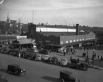 Description :VUE D'ENSEMBLE DU MARCHE LANSDOWNE SITUE PRES DE LA RIVIERE ST-FRANCOIS. EN AVANT-PLAN, DES AUTOS SUR LA RUE KING. A DROITE, DES GENS FONT LEURS EMPLETTES. EN ARRIERE-PLAN, L'EGLISE ST-JEAN-BAPTISTE.