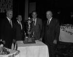 Description :QUATRE HOMMES ENTOURENT LE TROPHEE ROBERT MARTINEAU REMIS AU JOUEUR LE PLUS GENTILHOMME DES AS DE QUEBEC. L'HOMME A L'EXTREME DROITE EST TOE BLAKE.