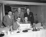 Description :GROS PLAN DE CINQ HOMMES DERRIERE UNE TABLE. LES DEUX HOMMES ASSIS A L'AVANT TIENNENT UN JOURNAL "SHERBROOKE DAILY RECORD". CELUI A GAUCHE EST JACQUES PLANTE. DERRIERE EUX, TROIS HOMMES ET UN FANION DU CLUB OPTIMISTE.