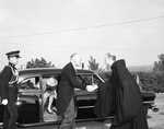Description :NNGF642: LE PERE HOTELIER DOM JEAN-FRANCOIS DE SALES VIDAL SERRE LA MAIN DU GOUVERNEUR GENERAL, VINCENT MASSEY. A GAUCHE, LE CAPITAINE GUY ROBILLARD ET MADAME MASSEY EN TRAIN DE SORTIR DE L'AUTOMOBILE. - NNGF643: LE VICE-ROI ET SA SUITE PASSEN...