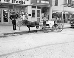 Description :VUE D'UN CHEVAL ATTELE A UNE CHARETTE SUR LE BORD DE LA RUE PRINCIPALE A MAGOG. A GAUCHE, UN POLICIER SONGEUR SEMBLE SE DEMANDER S'IL DOIT EMETTRE UNE CONTRAVENTION CAR LE CHEVAL EST PLACE A COTE D'UN PARCOMETRE. A DROITE, L'AVANT D'UNE AUTO. ...