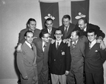 Description :NEUF HOMMES REPARTIS SUR DEUX RANGEES DEVANT UN DRAPEAU DU QUEBEC. PREMIERE RANGEE, SIRICE HUARD, JEAN-LOUIS BLANCHARD, HENRI-PAUL LEMIEUX, GASTON GAGNON ET MAURICE PARISEAU. DEUXIEME RANGEE: HENRI BRUNELLE, MARTIAL BERARD, MARCEL BUREAU ET MA...