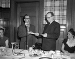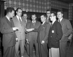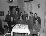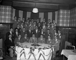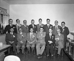 Description :LES MEMBRES DU JEUNE COMMERCE SONT PLACES SUR QUATRE RANGEES DERRIERE UNE TABLE. PARMI EUX, PREMIERE RANGEE: GERARD GAUTHIER, MAURICE BEAUDRY, JEAN-PAUL ROUILLARD, HENRI BRUNELLE, LUCIEN BEDARD, JEAN-LOUIS BLANCHARD ET TONY BEGIN.