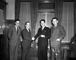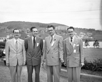 Description :QUATRE HOMMES EN HABIT ET CRAVATE, COTE A COTE A L'EXTERIEUR. DE GAUCHE A DROITE: MAURICE ALLARD, PRESIDENT ELU DU JEUNE COMMERCE DE SHERBROOKE, LOUIS DUSSAULT, PRESIDENT PROVINCIAL DES JEUNES CHAMBRES DE COMMERCE, LUCIEN BEDARD, PRESIDENT REG...