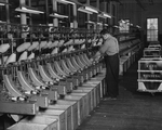 Description :LUDOVIC BOUCHER S'ACTIVE A CHANGER UNE BOBINE DE LAINE SUR UNE BOBINEUSE. AU HAUT DE LA MACHINE, DES FUSEAUX SE DEROULENT SUR DEUX BOBINES. LUDOVIC BOUCHER CHANGE UNE BOBINE PLEINE, POUR UNE VIDE. AU PLAFOND, DES NEONS. A DROITE, DES BACS A CO...