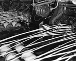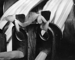 Description :GROS PLAN SUR LA PARTIE ASSEMBLEUSE DE L'ETIREUSE A LAINE. ON REMARQUE QUE LA LAINE EST ATTACHEE SUR L'APPAREIL.