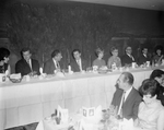 Description :HOMMES ET FEMMES EN TENUE DE SOIREE, ASSIS A DES TABLES DE BANQUET GARNIES DE COUVERTS, PANIERS A PETITS PAINS, CARTES, ETC. DE GAUCHE A DROITE: MADAME ET MONSIEUR MAURICE HEBERT, MONSIEUR KLEIN, ROGER DESRUISSEAUX, MME DESRUISSEAUX, MME K. JA...
