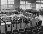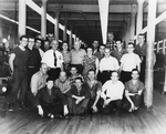Description :20 HOMMES ET DEUX FEMMES DANS LE DEPARTEMENT DE TISSAGE DE LA PATON. DES NEONS AU PLAFOND, LES PLANCHERS SONT EN LATTES DE BOIS FRANC, DES POUTRES DE SOUTIEN, EN METAL, SONT VISIBLES. SUR LA PREMIERE RANGEE COMPREND, LES TRAVAILLEURS SONT ASSI...