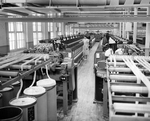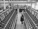 Description :VASTE SALLE OU DES CENTAINES DE BOBINES SUBISSENT LA TORSION DU FIL QU'ELLES CONTIENNENT.