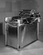Description :BOITE CARREE METALLIQUE, SURMONTEE D'UN MOULINET AUTOMATIQUE, SERVANT A TEINDRE DES ECHANTILLONS.