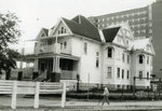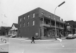 Description :VUE DE BIAIS DE L'EDIFICE DE TROIS ETAGES ET DEMI DE STYLE QUEEN ANN AVEC REVETEMENT EN BOIS. HOTEL-DIEU A L'ARRIERE. UN HOMME AVEC UNE CANNE PASSE A L'AVANT.