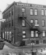 Description :VUE DE BIAIS DE L'EDIFICE A PARTIR DE L'INTERSECTION ALBERT ET WEBSTER. EDIFICE DE TROIS ETAGES AVEC REVETEMENT EN BRIQUE. FACADE FACTICE. PILASTRES. SUR LE COTE, DEUX AFFICHES INDIQUANT DRAPERIES TEXTILES ET PRODUITS TEXTILES. ESCALIER DE SEC...