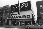 Description :VUE DE LA FACADE ET DU COTE DROIT DE L'EDIFICE DE TROIS ETAGES AVEC REVETEMENT EN BRIQUE ET EN TOLE. SMITH SAVARD EST INSCRIT EN TRES GRAND FORMAT AU CENTRE TANDIS QUE REGENT EST INSCRIT SUR UNE AFFICHE VERTICALE. VITRINES AU REZ-DE-CHAUSSEE. ...
