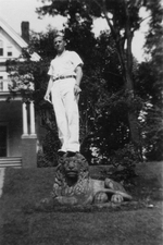 Description :UN HOMME VETU DE BLANC SE TIENT DEBOUT SUR LA TETE D'UN LION SCULPTE EN FACE DE L'HOPITAL NOEL. L'EDIFICE POSSEDE UN PORTIQUE A COLONNES.