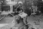 Description :UNE FILLETTE D'ENVIRON 10 ANS PREND LA POSE SUR UN LION SCULPTE DEVANT LA MAISON BLANCHE. ELLE PORTE UNE JUPE ET UN BERET. EN ARRIERE-PLAN, LA MAISON BLANCHE ET DEUX VOITURES.