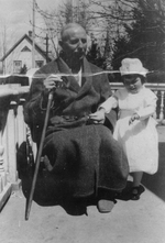 Description :OLIVA NOEL, AGE D'ENVIRON 70 ANS, ASSIS, UNE ENFANT D'ENVIRON 5 ANS A SES COTES. IL PORTE UN LONG MANTEAU SOMBRE ET TIENT UNE CANNE A LA MAIN. LA PETITE FILLE PORTE UN HABIT D'INFIRMIERE. TOUS LES DEUX SONT SUR LE PERRON DE LA RESIDENCE NOEL.