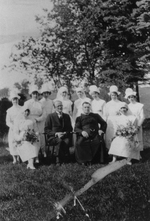 Description :GROUPE DE 10 JEUNES INFIRMIERES NON IDENTIFIEES. DEUX SONT ASSISES, LES AUTRES SONT DEBOUT. DEUX HOMMES EN HABITS SOMBRES, AU CENTRE, DONT UN RELIGIEUX.