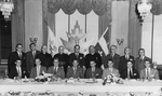 Description :SUR DEUX RANGEES, LES CONVIVES SONT PLACES DERRIERE LA TABLE D'HONNEUR DU BANQUET. LE CLUB DES FRANCS RECOIT LE COMITE GENERAL. 1ERE RANGEE : GASTON THERRIAULT, PROPAGANDISTE GENERAL; GILLES DAIGNEAULT, GOUVERNEUR GENERAL; AIME BERGERON, SECRE...