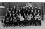 Description :TRENTE-HUIT ECOLIERS PRENNENT LA POSE. L'ENSEIGNANT, UN FRERE DU SACRE-COEUR, EST AU CENTRE DU GROUPE. PAUL DENAULT EST AU PREMIER RANG A LA 3E POSITION, LES GARCONS ONT LES BRAS CROISES.