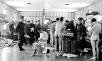 Description :GROUPE DE MILITAIRES QUI PASSENT LEUR EXAMEN MEDICAL. L'UN D'EUX EST ASSIS SUR UN BANC, QUELQUES-UNS SONT NUS ET LES AUTRES PRENNENT LE RANG. A COTE, DU LINGE SUR LES TABLETTES, DES BOITES D'UNIFORMES PAR TERRE. DEUX OFFICIERS LES SURVEILLENT,...