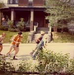 Description :UN GROUPE DE CINQ PERSONNES EN TRAIN DE COURIR AU COIN SANBORN-BALL. TROIS D'ENTRE ELLES PORTENT DES CHAPEAUX DE PAILLE. DEUX PERSONNES PORTENT LE CHANDAIL OFFICIEL DU FESTIVAL DES CANTONS. UNE FEMME DEBOUT SUR LA TERRASSE DE SA MAISON CONSTRU...