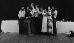 Description :1.1 HUIT MEMBRES DE LA TROUPE SONT EN FILE INDIENNE DEVANT UNE GRANDE TABLE. IL Y A DE GAUCHE A DROITE: PIERROT ALIAS PIERRE FILION (NARCISSE), FRANCOIS TESSIER (2 DENTS), REJEAN DAOUST (GRAND FOU CERVOLENT), JO-ANNE BLOUIN (JOJO LA CAROTTE),...