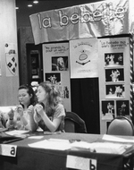 Description :DEUX JEUNES FEMMES, DONT MARJOLAINE ARSENAULT A DROITE, A UNE TABLE. DERRIERE ELLES, UN PANNEAU PORTANT LE TITRE LA BEBELLE PRESENTE DES PHOTOS DES REPRESENTATIONS DE "ME PRENDS-TU POUR UN HERO?" ET DE "LA BEBELLE AUX GARS DORMANTS".
