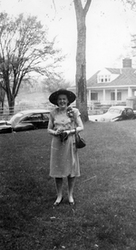 Description :9.1 : YVETTES REEVES SUR UN TERRAIN. DERRIERE ELLE, UN ARBRE ET UNE MAISON (EN PARTIE). ON APERCOIT (EN PARTIE) QUATRE VOITURES. YVETTE REEVES PORTE UN CHAPEAU AINSI QU'UNE ROBE. UN CORSAGE EST EPINGLE SUR SA ROBE. ELLE TIENT UNE CIGARETTE ET ...
