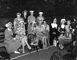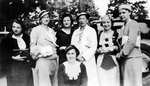 Description :GROUPE DE FEMMES ASSEMBLEES A L'EXTERIEUR. DEUXIEME RANGEE : LA QUATRIEME PERSONNE EST BERNADETTE LANGIS, VETUE EN BLANC. LES FEMMES PORTENT DES CHAPEAUX FEUTRE ET DES TAILLEURS.