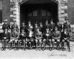 Description :LE GROUPE, COMPOSÂ D'OFFICIERS ET D'HOMMES VÃ’TUS EN COMPLET VESTON-CRAVATE ET DE CHAPEAUX HAUT-DE-FORME, EST DEVANT LE MANEGE MILITAIRE. PREMIERE RANGÂE, DE GAUCHE A DROITE : L. RODOLPHE LANGIS, ECHEVIN; INCONNU; LUDGER FOREST, MAIRE; SON ...