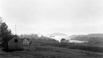 Description :UNE GRANGE ET QUELQUES MAISONS SONT PRESENTES SUR LA PHOTO. ON APERCOIT UN COURS D'EAU (EN PARTIE) AINSI QUE DES MONTAGNES.
