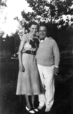 Description :UNE FEMME INCONNUE ET ALBERT LANGIS. PHOTOGRAPHIE PRISE A L'EXTERIEUR. UNE AUTOMOBILE EST DERRIERE LE COUPLE.