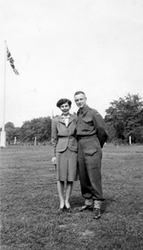 Description :CLAIRE LANGIS POSE AVEC UN MILITAIRE DANS UN CHAMP. LE DRAPEAU BRITANNIQUE FLOTTE AU SOMMET D'UN MAT. ON APERCOIT QUELQUES ARBRES AU LOIN.