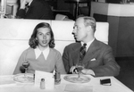 Sujet principal :CLAIRE LANGIS ET UN AMI DANS UN RESTAURANT DE MONTREAL