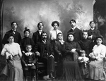 Description :PHOTO DE STUDIO AVEC DECOR EN TROMPE-L'OEIL. LES COTES DE LA TOILE DE FOND SONT VISIBLES. JOSEPH LANGIS ET VICTORIA DUFAULT EN COMPAGNIE DE LEURS ENFANTS. RANGEE DU HAUT : OLIVA, GEORGES, BELLA, RODOLPHE, ?. RANGEE DU CENTRE : ?, ROMEO, EVA. R...