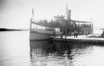 Description :ARRET DU BATEAU AU QUAI DE L'ILE HOWARD POUR VERIFICATION DOUANIERE. PLUSIEURS PERSONNES SONT SUR LE PONT. LE NEGATIF MONTRE UN PETIT PAVILLON A DROITE DU BATEAU.