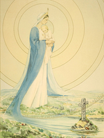 Description :DESSIN DE LA VIERGE TENANT JESUS DANS SES BRAS. LA VIERGE DOMINE LA VILLE DONT ON VOIT LA CROIX DU PIN SOLITAIRE.