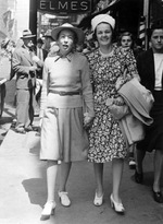 Description :BERNADETTE LANGIS ET UNE AMIE SUR LE TROTTOIR A TORONTO. CLAIRE LANGIS EST A COTE D'UNE ENSEIGNE DE COIFFEUR. D'AUTRES PERSONNES CIRCULENT SUR LE TROTTOIR. ON APERCOIT (EN PARTIE) L'AFFICHE DE LA BOUTIQUE "ELMES". LES DEUX FEMMES SONT A PROXIM...