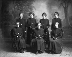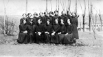 Description :PHOTO DE STUDIO AVEC DECOR EN TROMPE-L'OEIL. TROIS JEUNES FILLES SONT ASSISES (RANGEE DU DEVANT). RANGEE DU FOND, A GAUCHE : BERNADETTE LANGIS. ELLES SONT TOUTES GANTEES ET ELLES PORTENT TOUTES UN MEDAILLON. ELLES PORTENT DES ROBES DITES "PLAN...