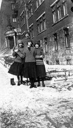 Description :QUATRE ETUDIANTES DEVANT LE COLLEGE MONT NOTRE-DAME. ELLES SONT VETUES EN TENUE HIVERNALE ET ELLES SE TIENNENT TOUTES PAR LA MAIN. DERRIERE ELLLES, L'ANCIENNE PARTIE DU MONT NOTRE-DAME. LE PORTIQUE EST DOMINE PAR LA STAUE DE LA SAINTE VIERGE. ...
