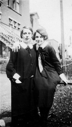 Description :BERNADETTE LANGIS, A GAUCHE, ET UNE AMIE. VETUES DE LEUR UNIFORME, ELLES SONT APPUYEES A UNE RAMPE DE FER. LA PARTIE ARRIERE DU COUVENT QUE L'ON APERCOIT EN PARTIE EST DERRIERE ELLES.