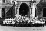 Description :CINQ RELIGIEUX SONT AU BAS DE LA PHOTO, ASSIS SUR DES CHAISES. UN GROUPE DE JEUNES GARCONS SONT DERRIERE EUX. ILS SONT VETUS DE LA SOUTANE RECOUVERTE DU SURPLIS. ON APERCOIT LA CATHEDRALE (EN PARTIE) AVEC SES VITRAUX ET LE PORTIQUE.